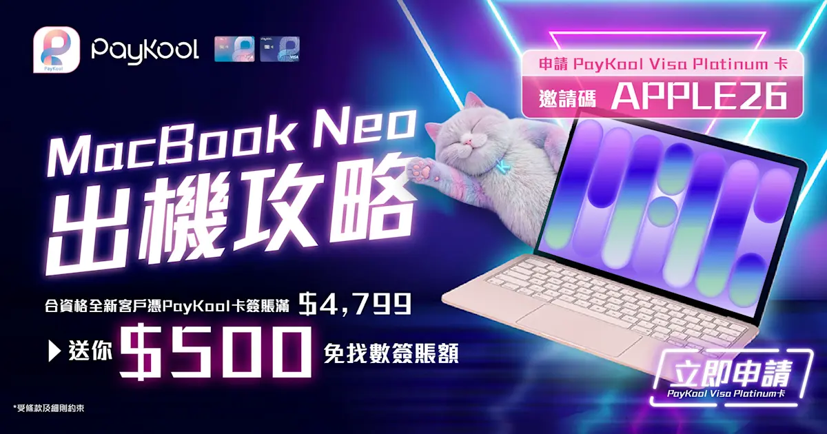 全新客戶只要於推廣期內輸入邀請碼「APPLE26」申請 PayKool Visa Platinum 卡,成功批核並簽賬滿 HK$4,799,可獲得:HK$500 免找數簽賬額迎新獎賞,換言之扣除迎新獎賞只需 HK$4,299 成本就可以入手 MacBook Neo!